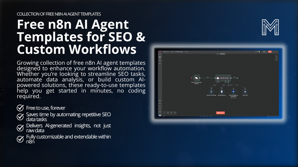 I’m always building and releasing new automation templates for n8n, completely free. These are premium, end-to-end workflows designed to replace custom SEO tools and handle your automation needs from start to finish. Be the first to know when a new AI agent is available by signing up for my newsletter. You’ll get early access, helpful tips, and never miss a workflow update.