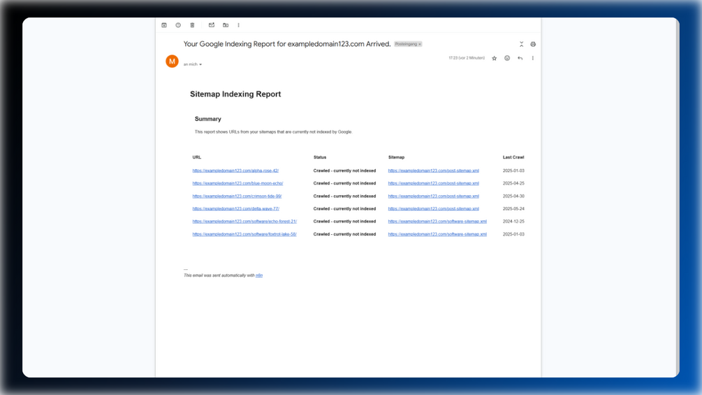 - Automated Email Reports: Receive clear reports highlighting deindexed pages.