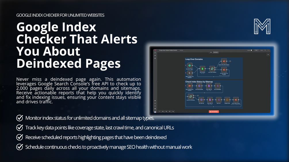 This n8n workflow automatically checks your Google index status, alerting you to deindexed pages so you can fix them fast. Monitor unlimited websites and sitemaps using Google Search Console's free API.