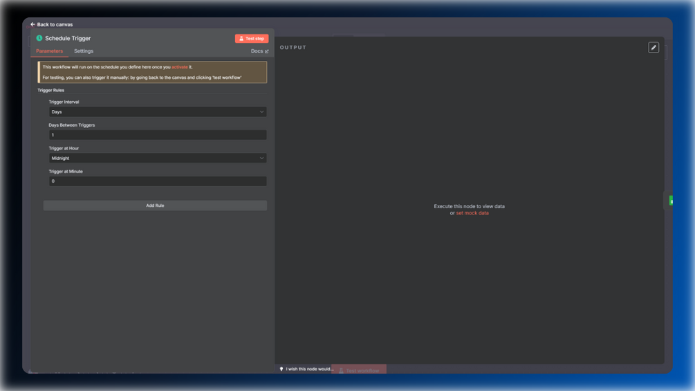 Configure daily or custom interval scheduling in n8n.