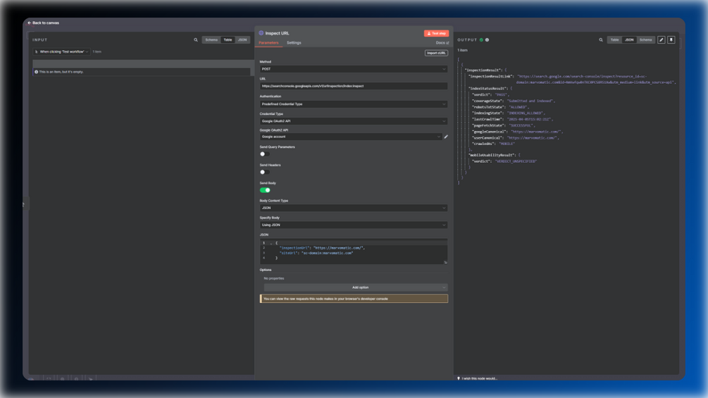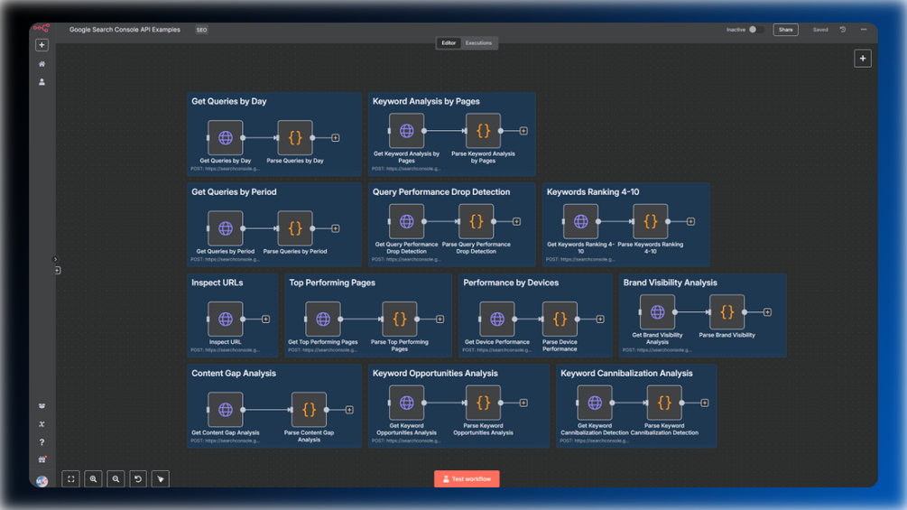 With this n8n template, you can leverage the HTTP node to retrieve data directly from Google Search Console, such as impressions, clicks, CTR, and position. Additionally, you can inspect any URL from your websites that are connected to Google Search Console. Two additional nodes will prepare the data so you can immediately analyze your website’s performance. I explain in the following video how to create the required credentials this workflow.