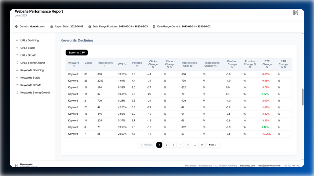 - Automatic Categorization: Instantly see which pages and keywords are Declining, Stable, Growing, or experiencing Strong Growth, so you can focus your efforts where they matter most.