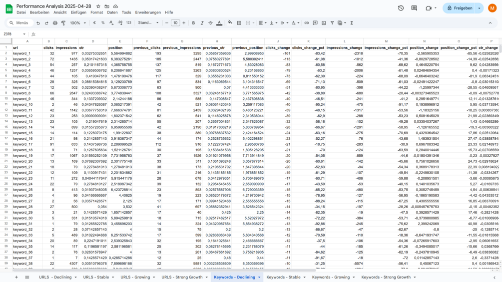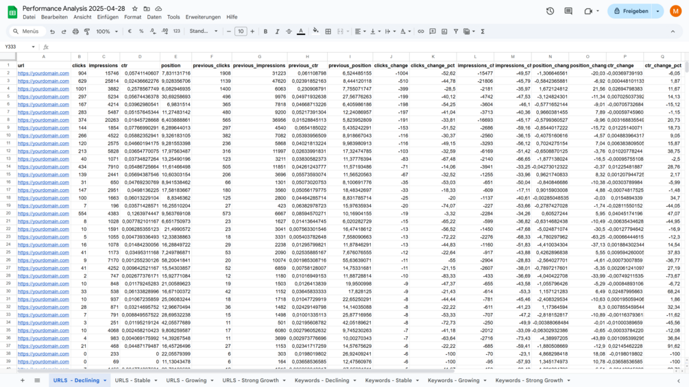 - Automatic Categorization: Instantly see which pages and keywords are Declining, Stable, Growing, or experiencing Strong Growth, so you can focus your efforts where they matter most.